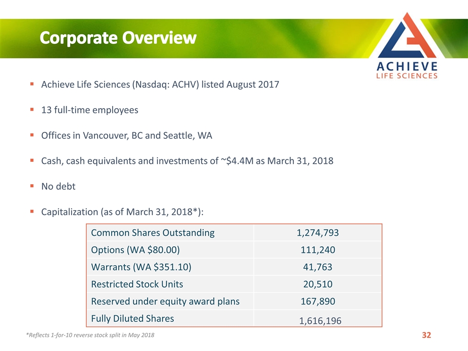 SEATTLE and VANCOUVER British Columbia May 23 2018 CNW -- Achieve Life Sciences Inc. ACHV a clinical-stage pharmaceutical company. ACHV has executed a 120 reverse split of its.